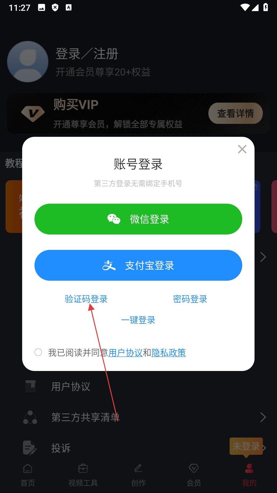 3、在账号登录选择页面,点击【验证码登录】,进入验证码登录信息填写页面。