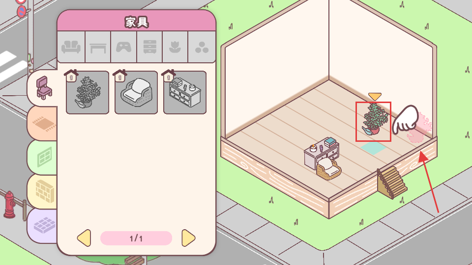 2、进入家具界面,选择盆栽等家具,拖动至小屋指定位置,装扮小屋提升温馨氛围。