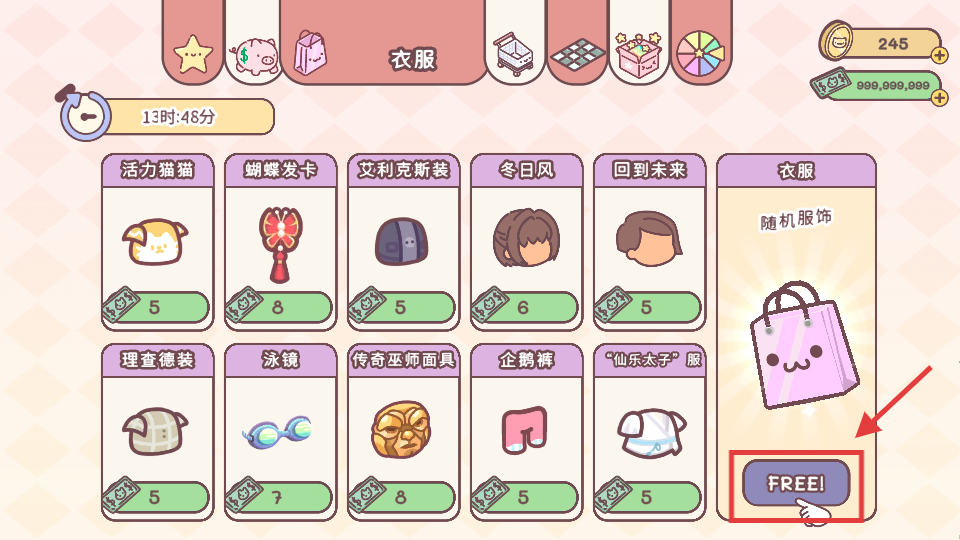 3、在衣服商店点击【FREE!】按钮,免费领取随机服饰,为角色更换装扮,增添趣味。