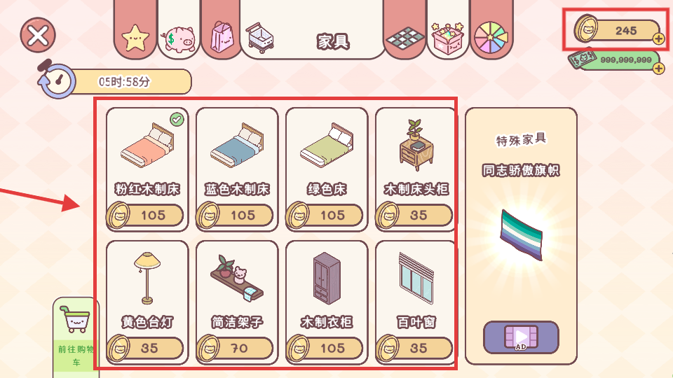 4、使用金币购买【粉红木制床】【蓝色木制床】等家具,装扮小屋,积累金币解锁更多家具。