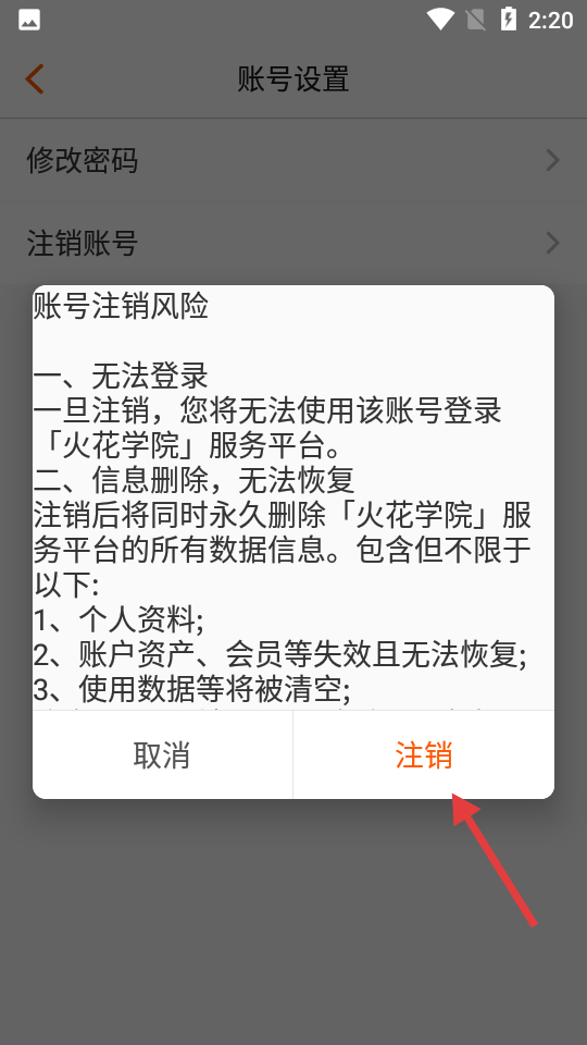 4、弹出“账号注销风险”提示框,点击【注销】,完成账号注销操作。