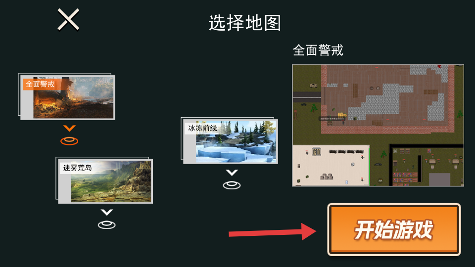 1、选择【全面警戒】等地图,点击【开始游戏】进入战场。