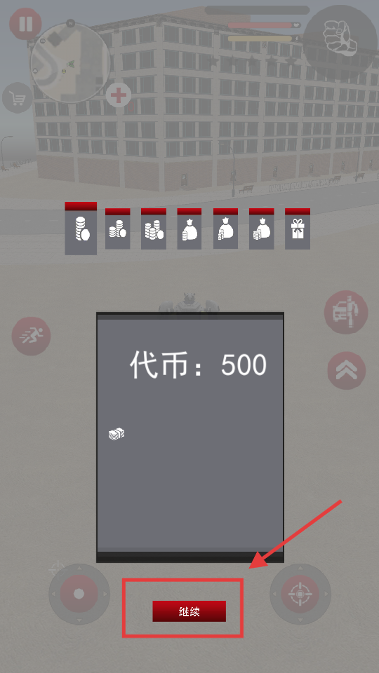 2、获得【代币-500】后,点击弹窗底部红框内的【继续】按钮,返回主场景推进任务。