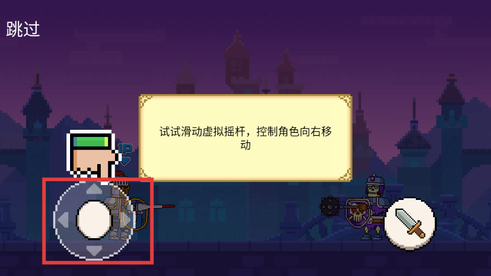 1、根据提示滑动【虚拟摇杆】,控制角色执行【向右移动】操作,完成初始移动教程。