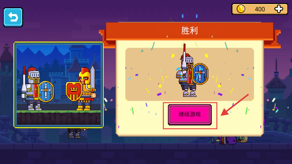 4、胜利后界面显示【金币-400】和【继续游戏】按钮,点击可进入下一关。