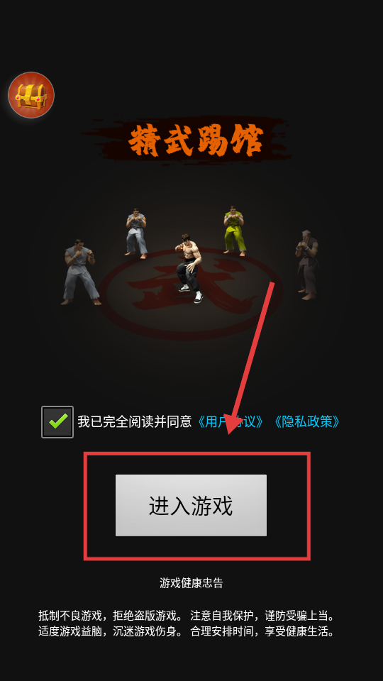 1、勾选【我已完全阅读并同意《用户协议》《隐私政策》】后,点击【进入游戏】开始精武踢馆玩法。