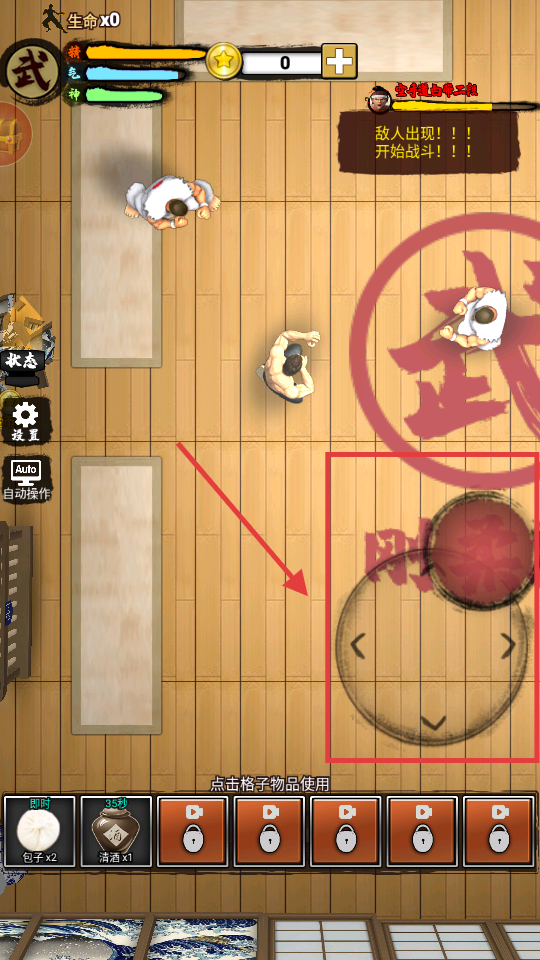 2、敌人出现时,按提示点击【格子物品】使用,为战斗做准备。