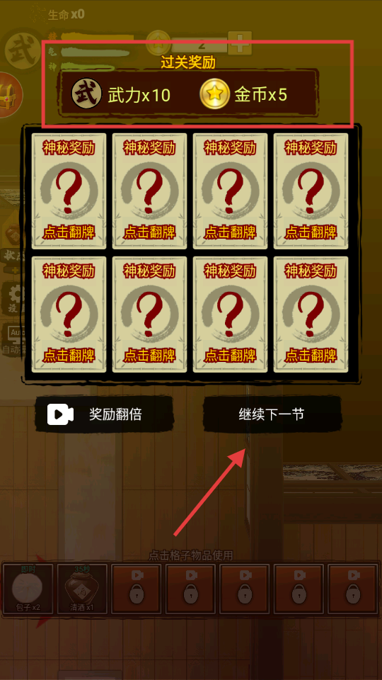 4、获得【过关奖励】(武力x10、金币x5)后,可选【奖励翻倍】或点击【继续下一节】。
