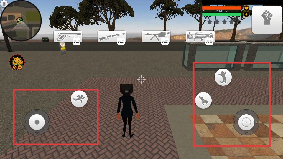 2、用左侧【移动-摇杆】控制角色移动,熟悉右侧【跳-按钮】【蹲-按钮】的动作操作,上方武器广告后期可解锁。