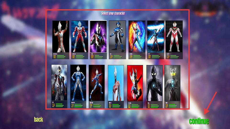 2、在【Select-your-character】界面选喜欢的奥特曼角色,选好后点击右下角【continue】继续。