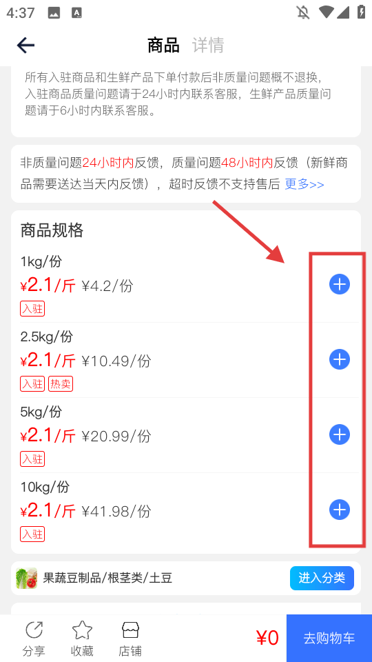 4、选择合适的商品规格,点击加号加入购物车,完成商品选购。