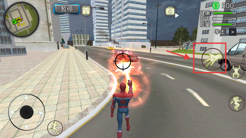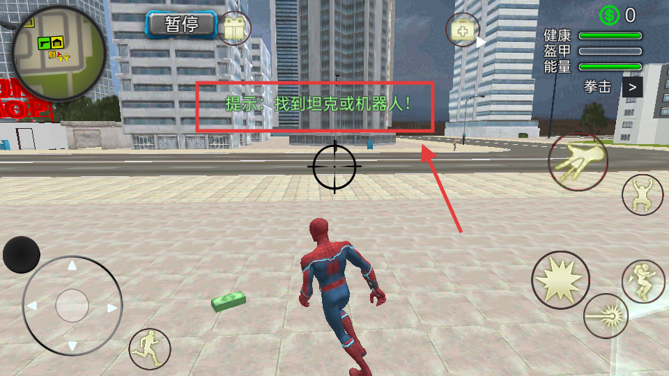 2、游戏内按提示寻找【坦克】或【机器人】,用左侧虚拟摇杆控制蜘蛛侠移动,注意界面上方状态条。