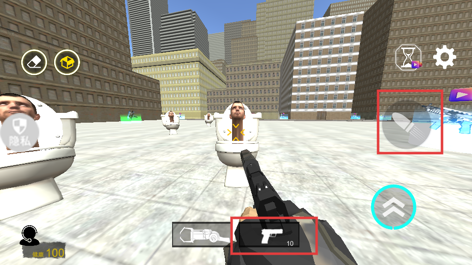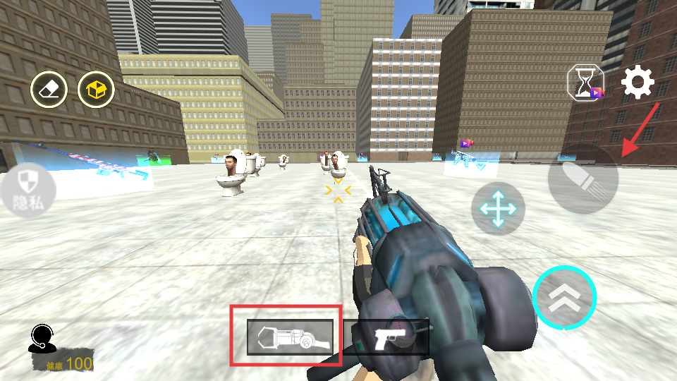 4、切换到【手枪】武器,瞄准前方【马桶-人形】目标,用右侧【画笔-工具】辅助攻击。