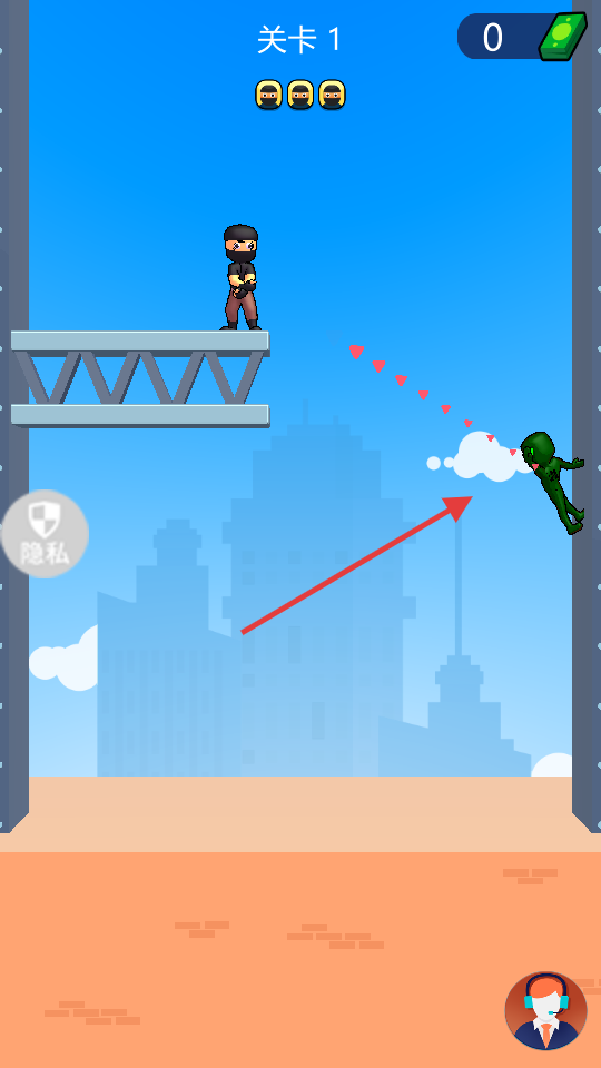 1、在【关卡1】中,观察绿色敌人位置,按红色箭头提示瞄准,准备发起攻击。
