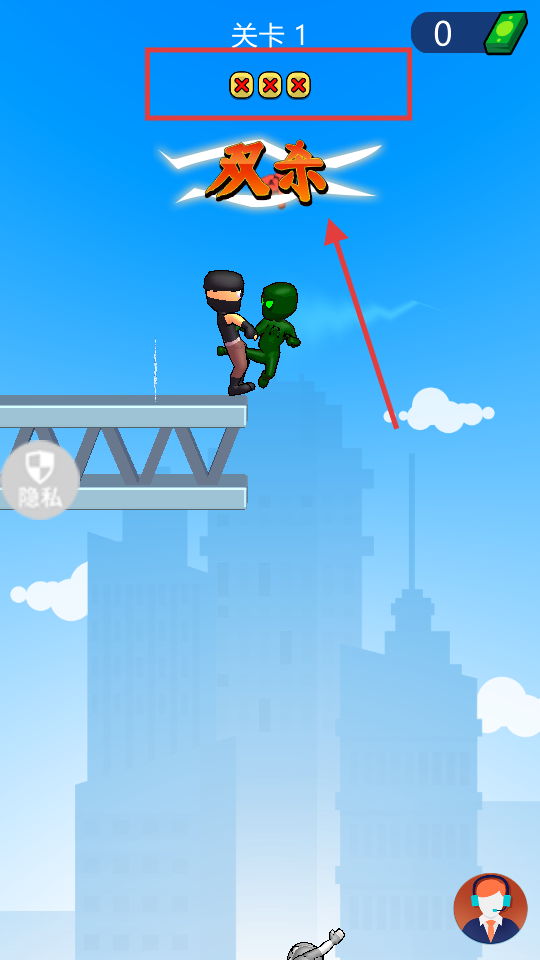 3、成功消灭敌人后会出现【双杀】提示,上方三个叉号确认全部清除。