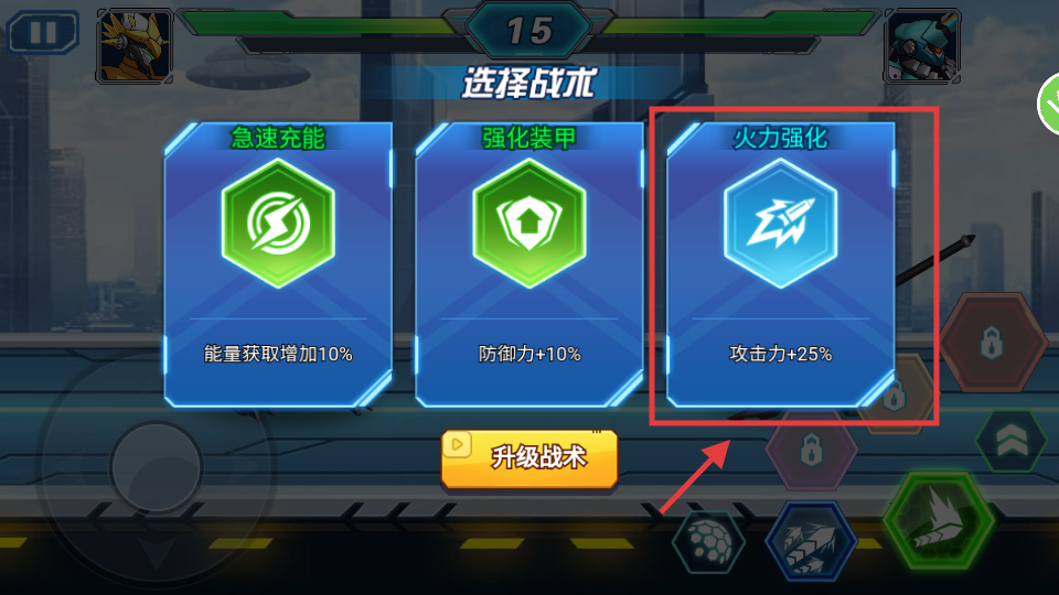1、战斗前选战术时,优先选【火力强化】,其增加25%攻击力,为后续输出打下强力基础。