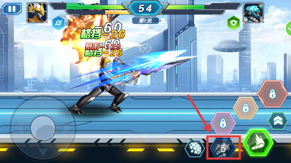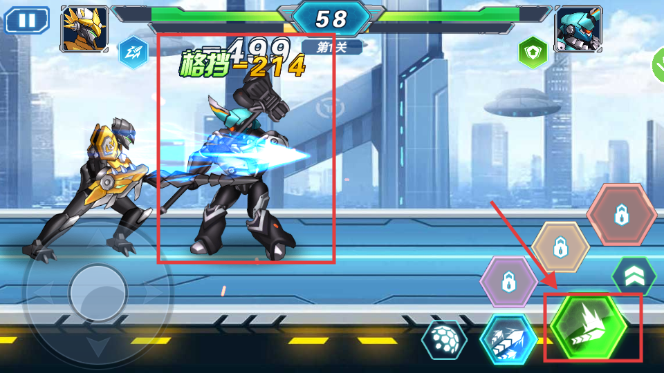 2、战斗中留意【格挡】数值,当敌方攻击触发高格挡时,点击右下角【绿色-技能】强化防御。