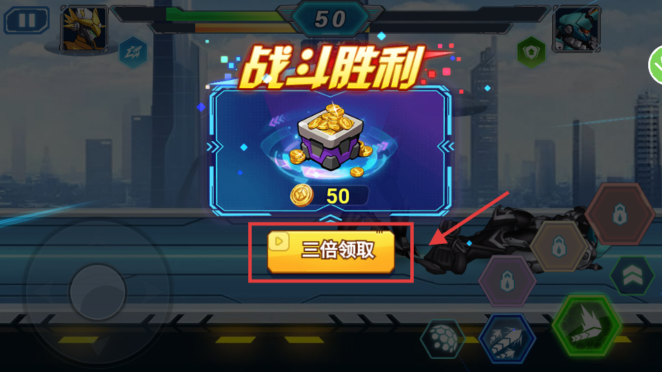 4、战斗胜利后,点击【三倍领取】按钮,观看广告能获三倍金币,提升资源获取效率。