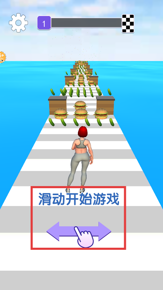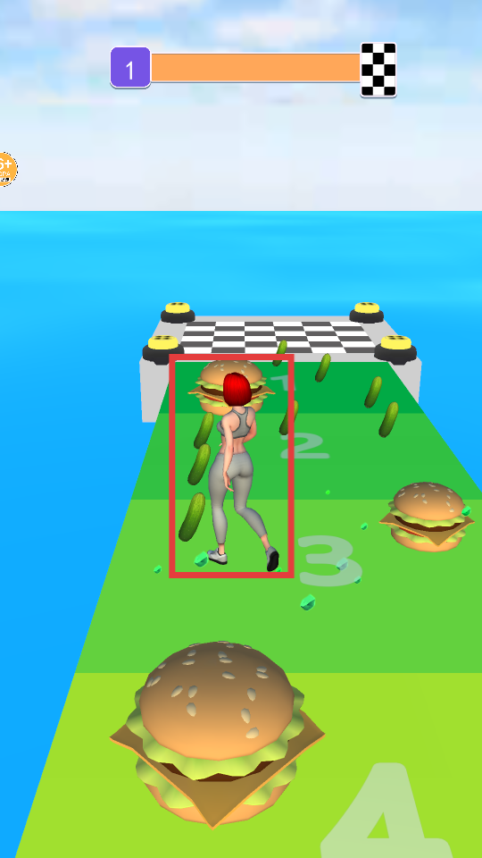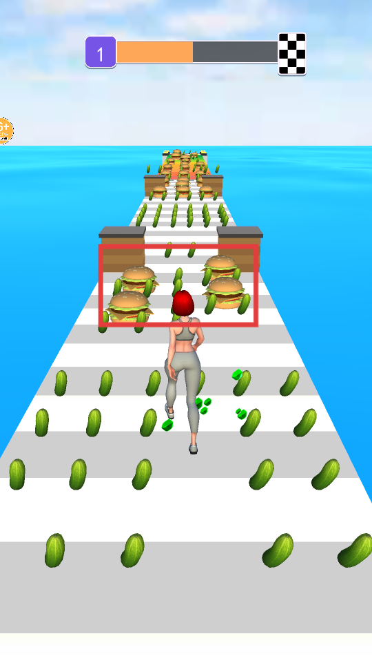 2、进入游戏后,操控角色前进,尽量躲避如红框内的【汉堡】,多收集黄瓜等健康食物。