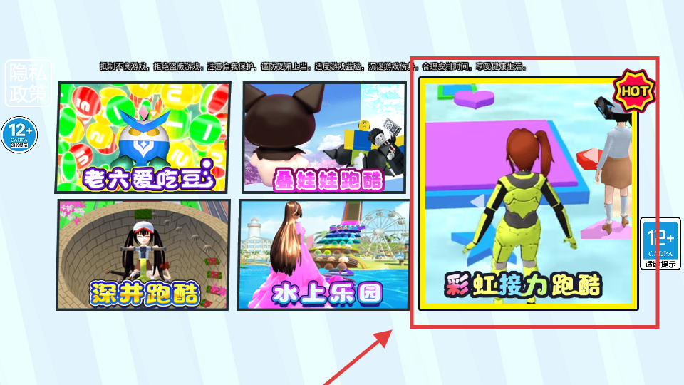 1、在游戏选择界面,点击带【HOT】标识的【彩虹接力跑酷】入口,进入该跑酷游戏。
