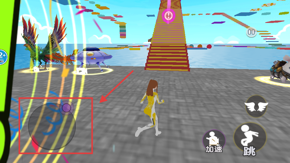 2、进入游戏后,通过左下角【移动-轮盘】控制角色方向,朝带粉色感叹号的阶梯前进。