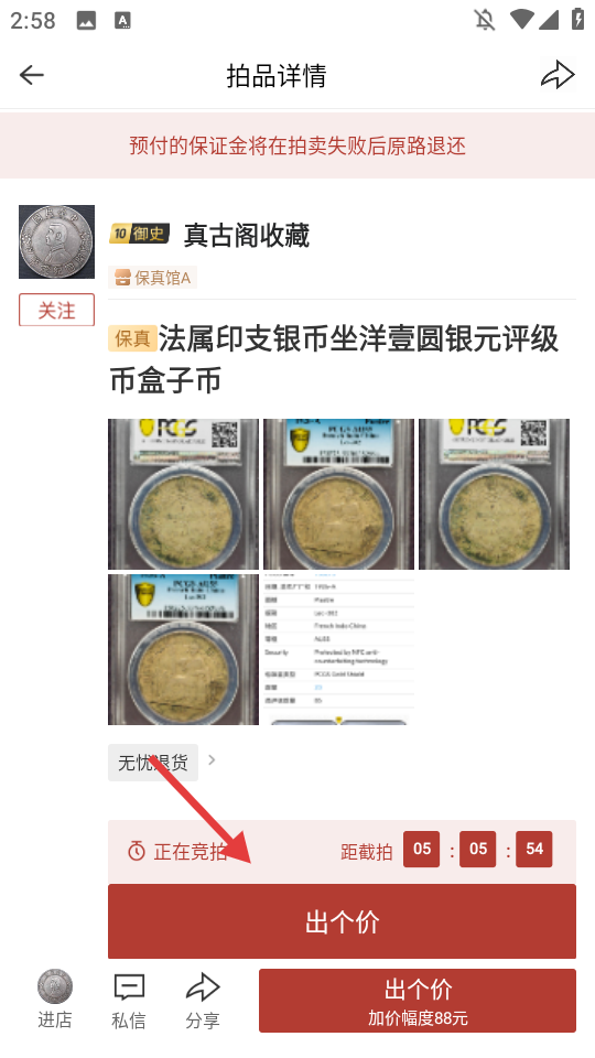 3、在拍品详情页点击【出个价】,弹出出价窗口。