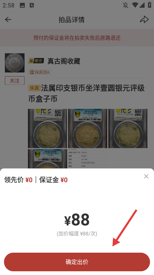 4、输入出价金额,点击【确定出价】,完成拍品出价操作。
