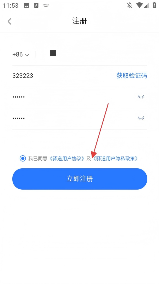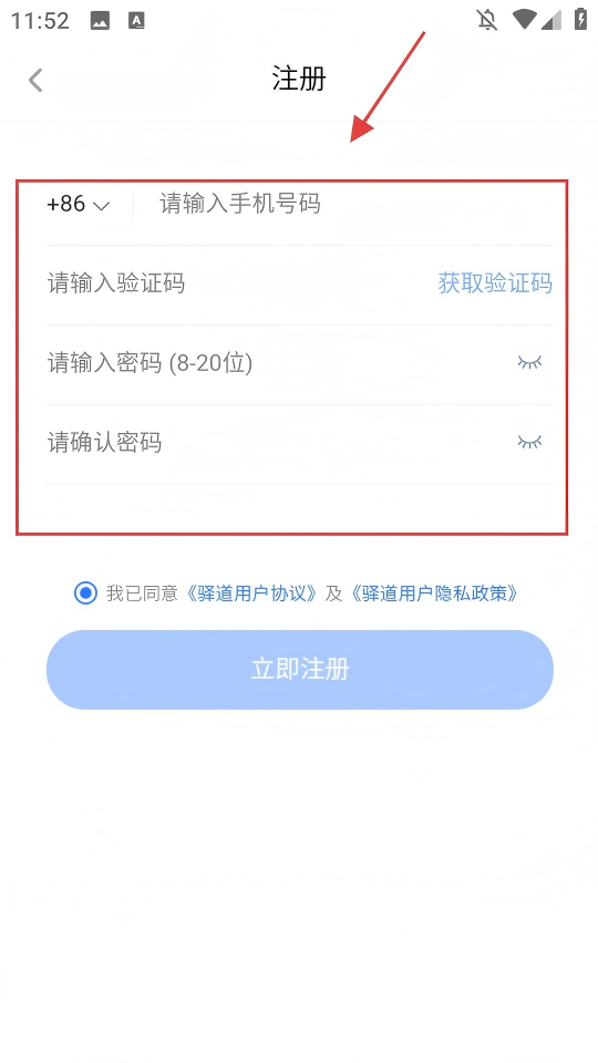 3、在注册页面填写手机号码、验证码、密码并确认密码。