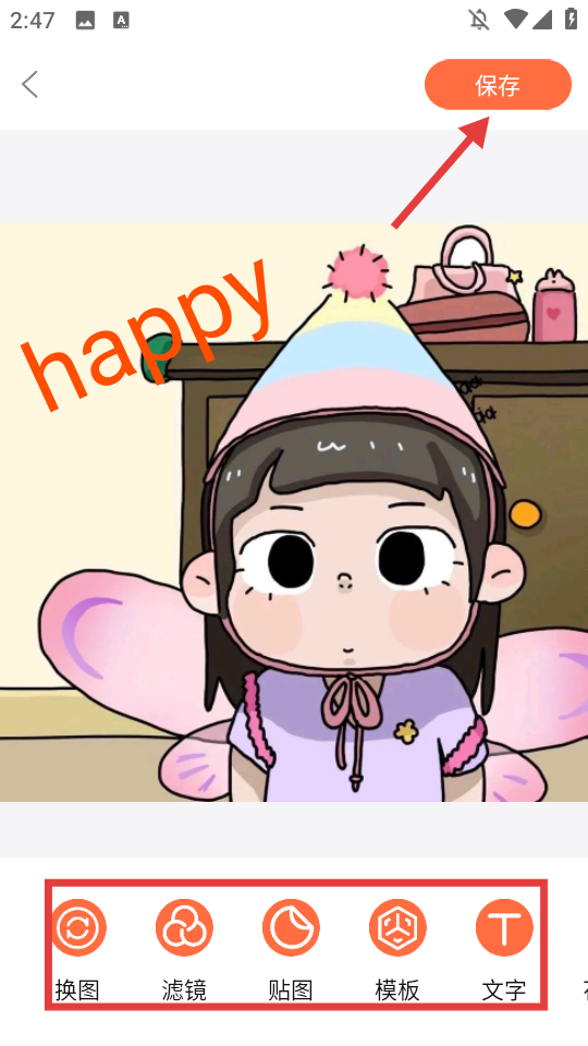 4、使用【换图】【滤镜】【贴图】【模板】【文字】等功能进行创作,完成后点击右上角【保存】,即可完成DIY头像制作。