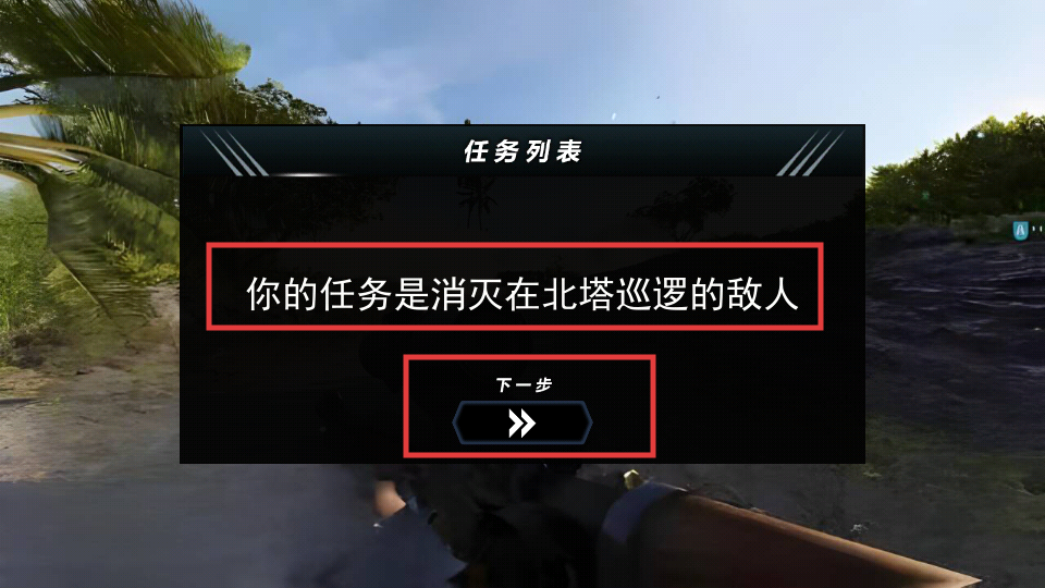 2、弹出【任务列表】显示任务是消灭在北塔巡逻的敌人,查看后点击下方按钮进入下一步流程。