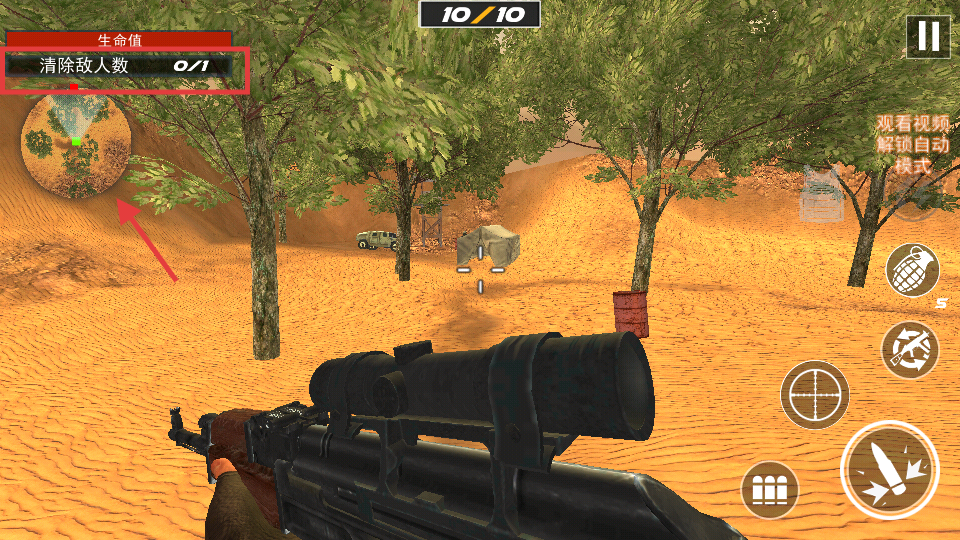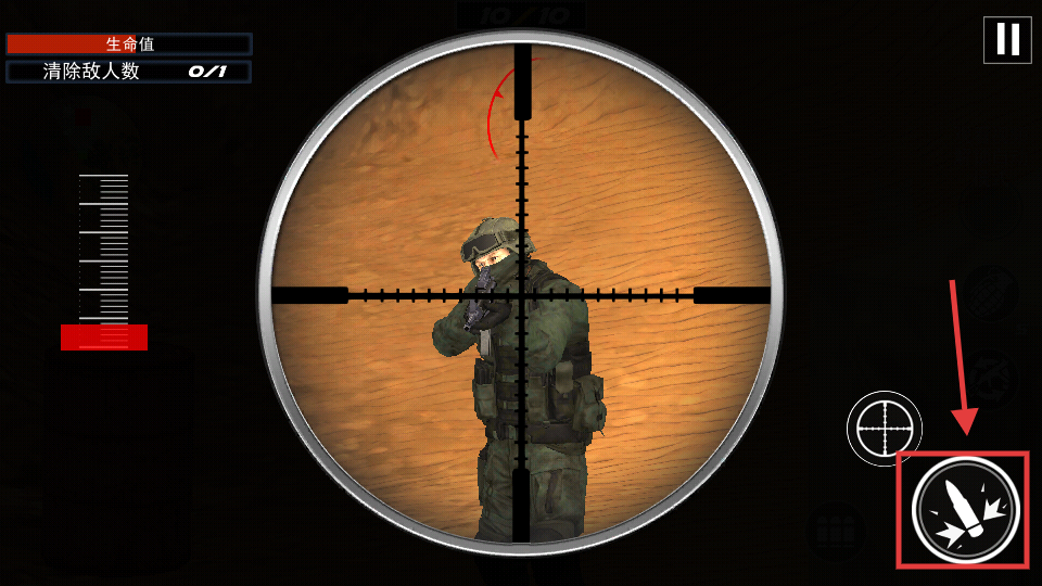 4、用狙击镜锁定敌人后,点击右下角的射击按钮即可发起攻击,精准命中目标完成清除任务。