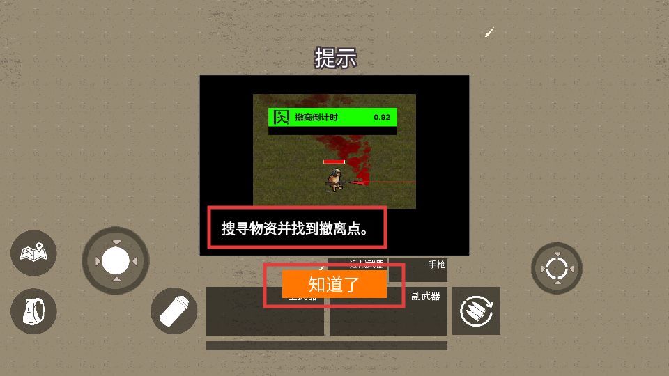 2、游戏会弹出提示,告知需要搜寻物资并找到撤离点,看完提示后点击【知道了】就能继续操作。