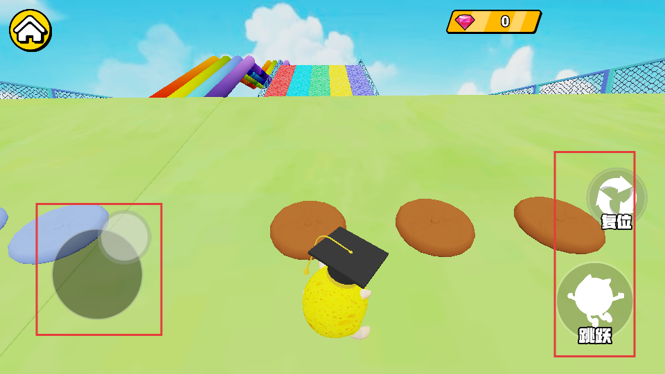 2、左侧摇杆控制移动,右侧【跳跃】键跨越障碍,失误时用【复位】重置角色位置,助力通关。