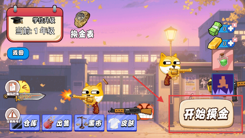 1、点击【开始摸金】进入校园跑酷场景,准备探索地图、搜索物资与武器。