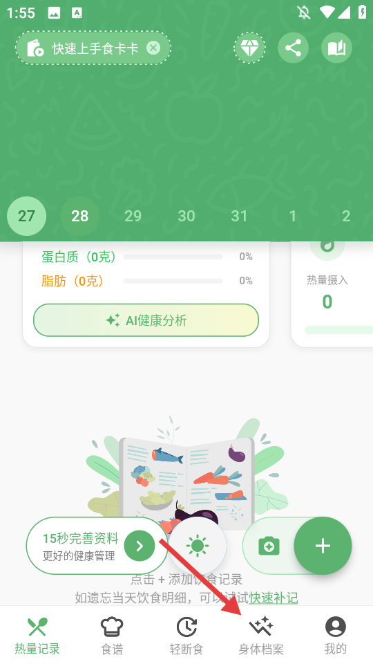 1、在这里就能快速的记录自己的饮食信息了,软件就会自动计算你摄入的卡路里;