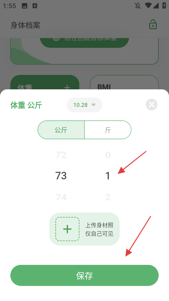 3、在体重输入界面选择体重单位(公斤/斤),调整体重数值,可选择上传身材照,完成后点击【保存】。