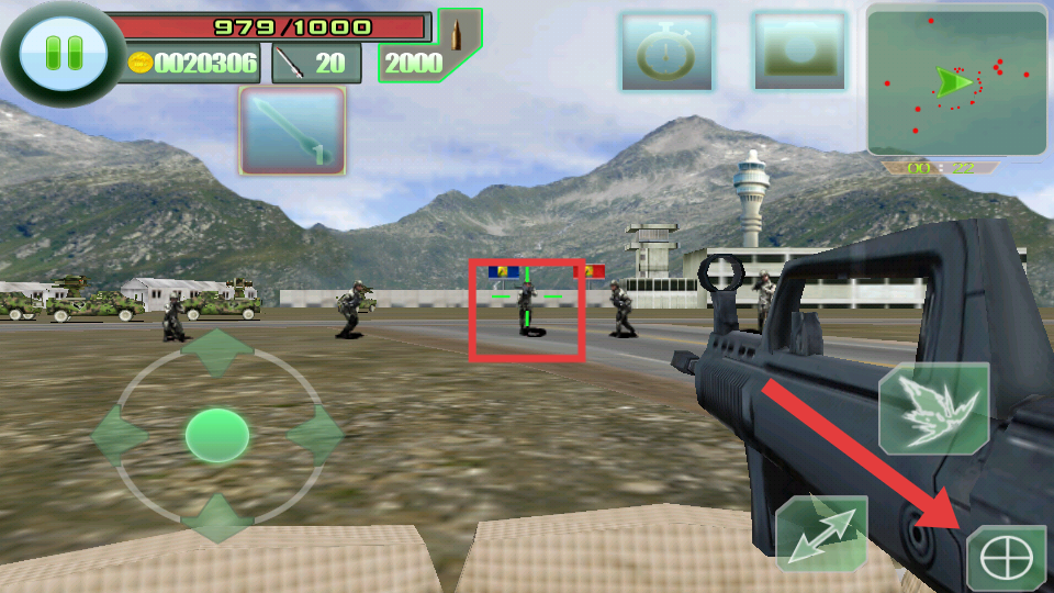 2、进入战斗场景后,通过屏幕左下角按键滑动视角瞄准敌人,点击屏幕右侧的开镜按钮进入瞄准状态。