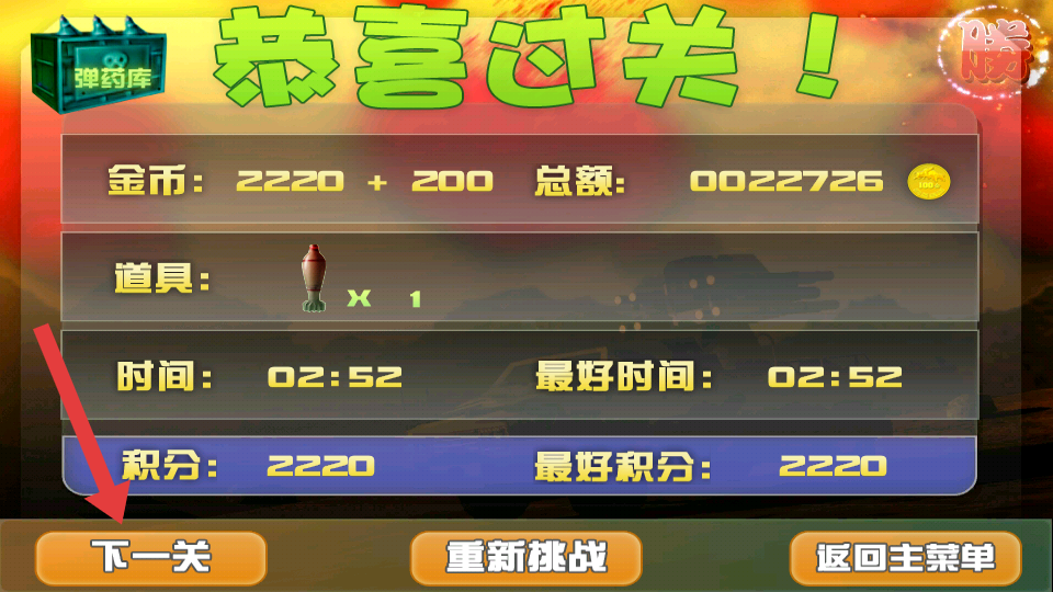 4、成功消灭关卡内所有敌人后,点击【下一关】按钮,继续后续关卡挑战。