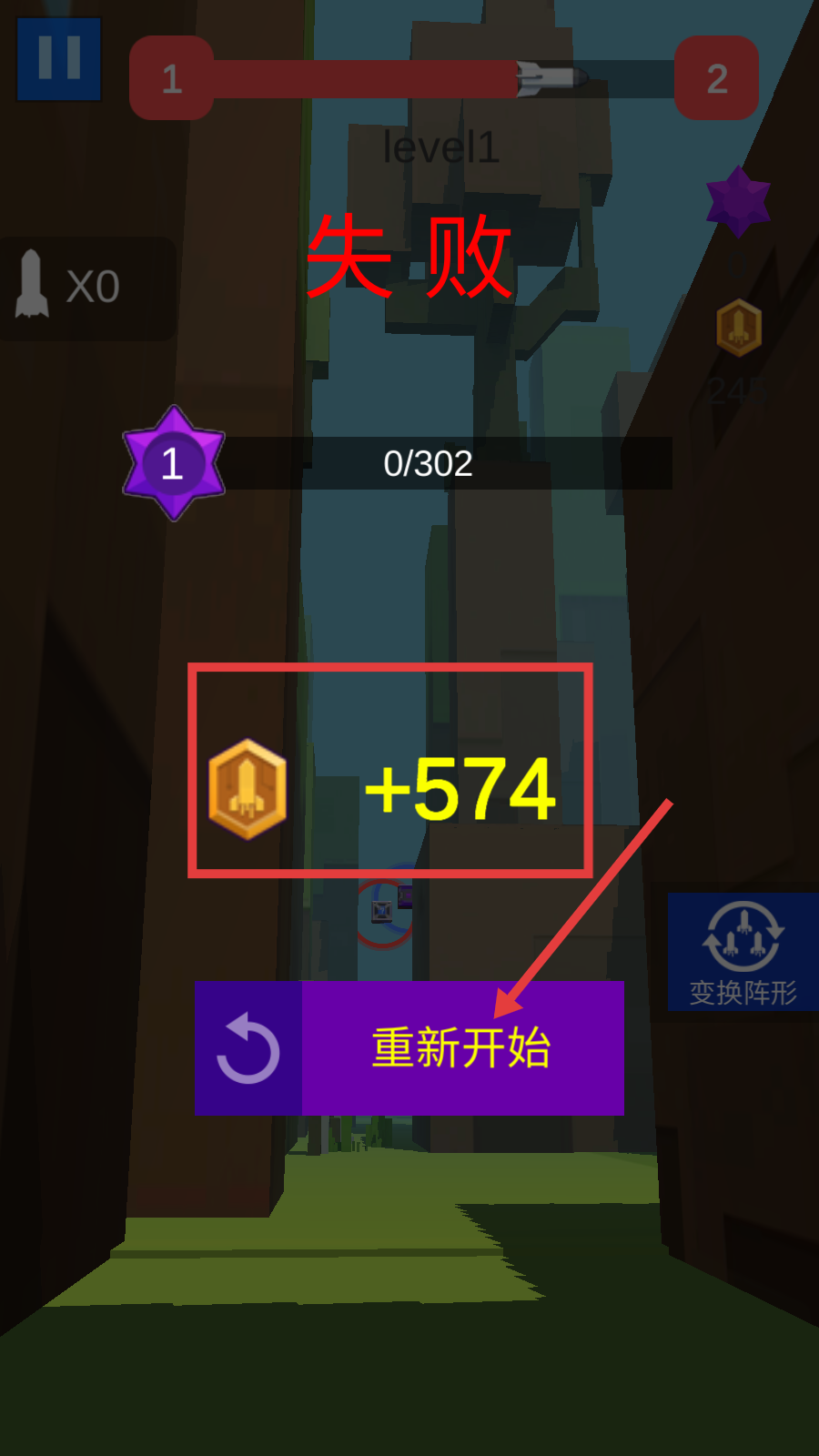 1、游戏失败后,点击【重新开始】继续游戏。