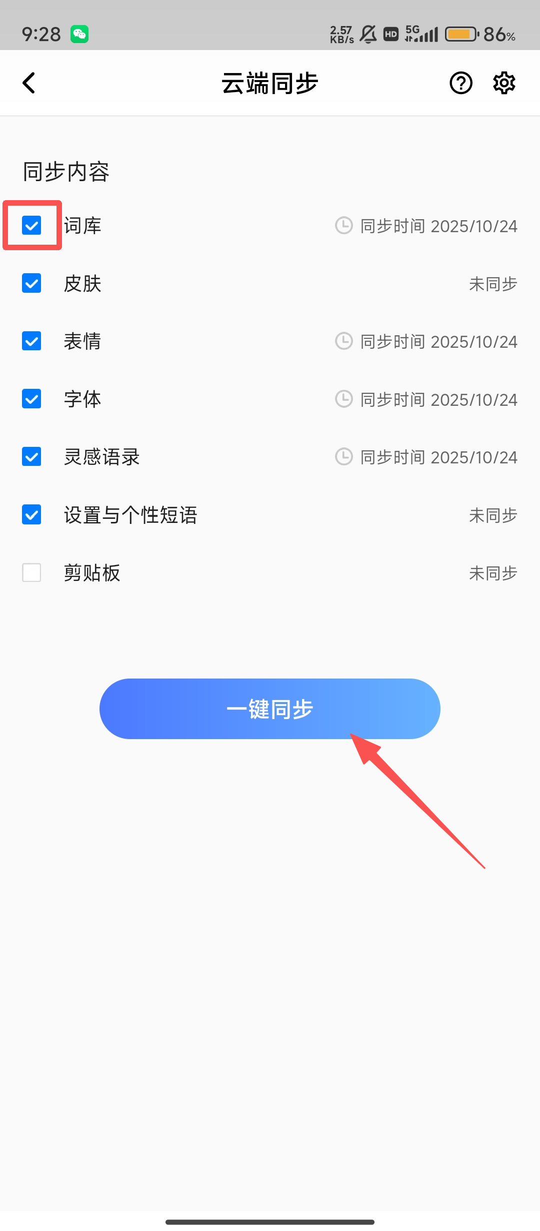 4、在云端同步界面,确认勾选【词库】等需要同步的内容,然后点击【一键同步】,就能完成词库同步啦。
