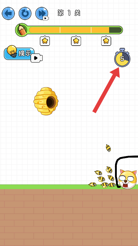 3、注意右上方秒表的倒计时标识,当倒计时结束后,小狗没被蜜蜂蛰到即可通关。