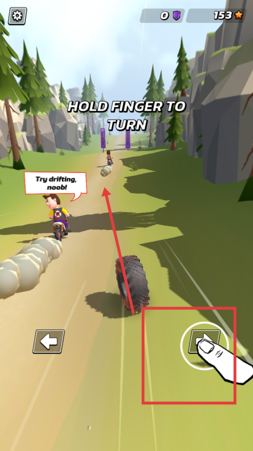 2、游戏过程中,看到【HOLD-FINGER-TO-TURN】提示,按住对应方向按键来控制轮胎转向,应对赛道情况。