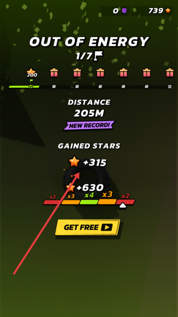 4、当出现【OUT-OF-ENERGY】提示时,本轮游戏结束,可查看【DISTANCE-205M】等数据,收获的星星能用于后续升级。