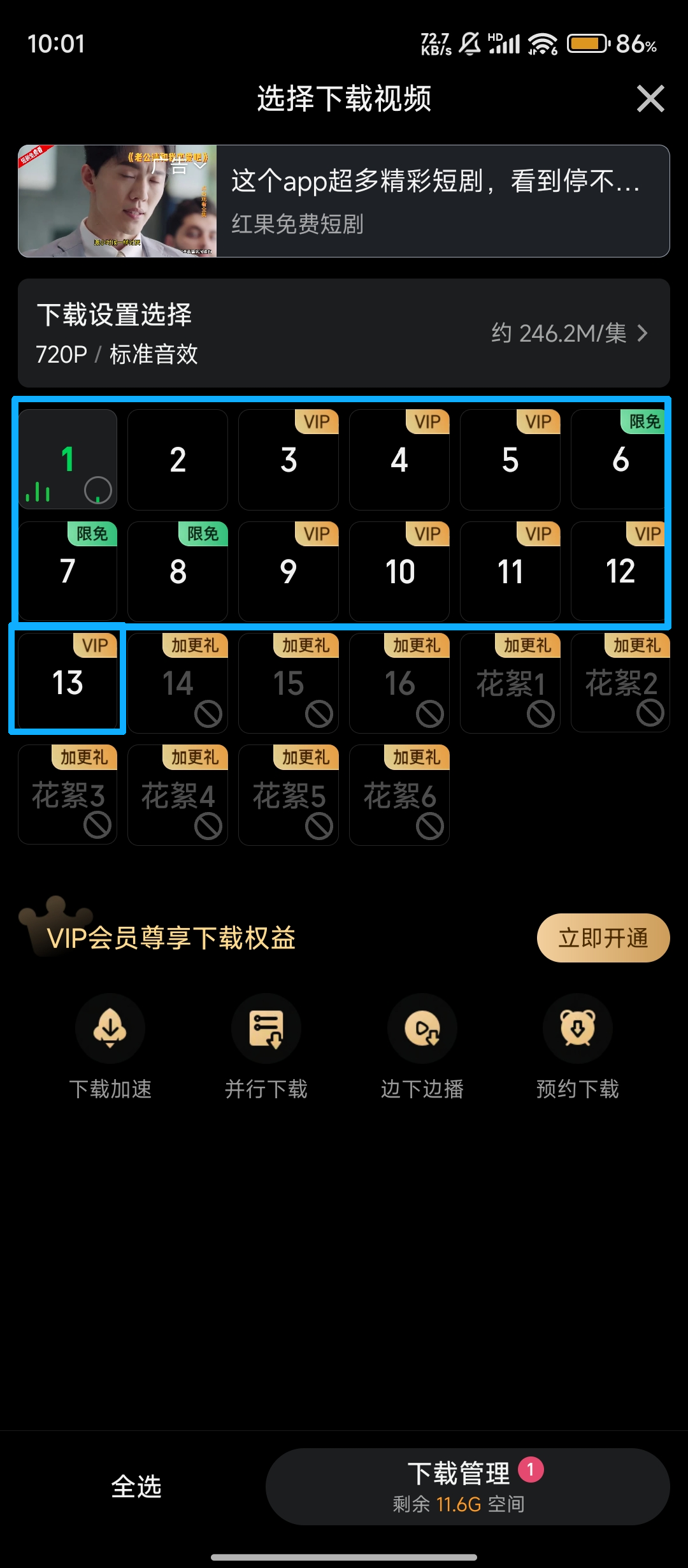 4、点击下载后,会进入选集界面,我们能选择要下载的集数,还能设置画质呢。