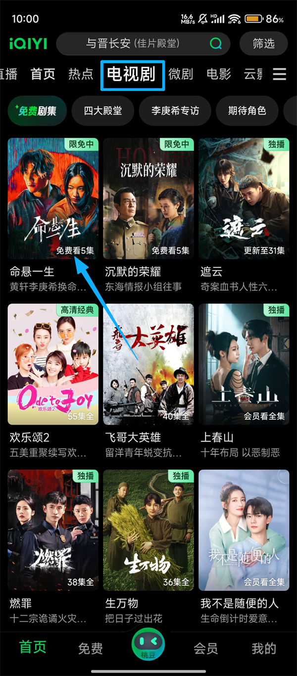 2、点击【电视剧】分类后,页面有【免费剧集】等标签,我们可从中挑选喜欢的剧集,点击就能进入播放页面啦。