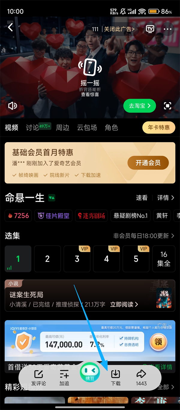 1、打开爱奇艺APP,进入视频播放界面,在下方会出现一个悬浮工具栏,点击其中的【下载】