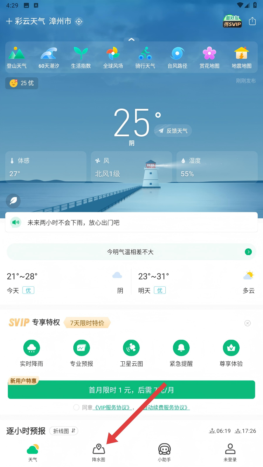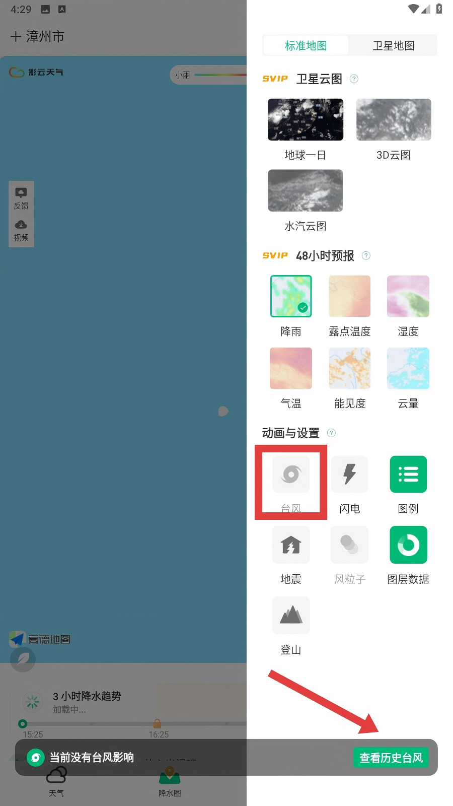 1、打开彩云天气App,点击底部【降水图】,可进一步查找台风相关功能呢。