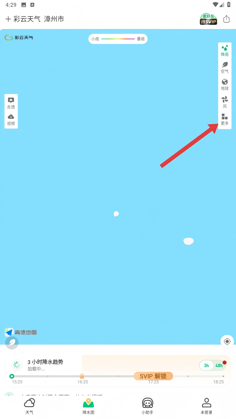 2、在降水图页面,点击右侧【更多】,展开菜单,准备查找台风入口呀。