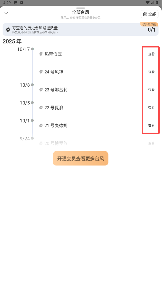 4、在历史台风页面,可查看如2025年各台风的信息,点击对应台风旁的【查看】,就能了解其详细路径等内容啦。