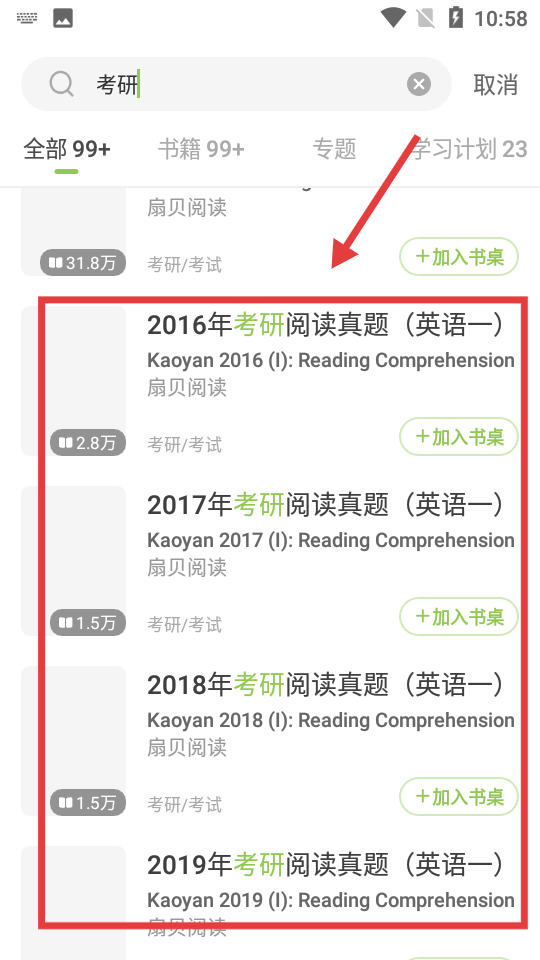 3、在搜索结果中选择考研真题,进入书籍详情页。